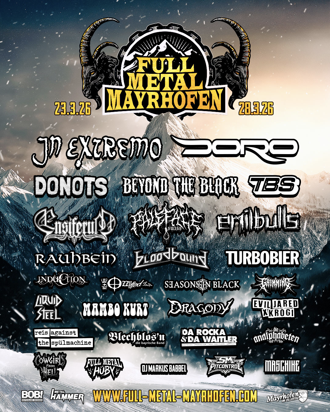 Jetzt ist es offiziell: Full Metal Mayrhofen 2026 ist bereit für die nächste Eskalationsstufe! Vom 23. bis 28. März 2026 verwandelt sich Mayrhofen-Hippach erneut in das lauteste Metal-Festival der Alpen – härter, wilder und legendärer denn je.