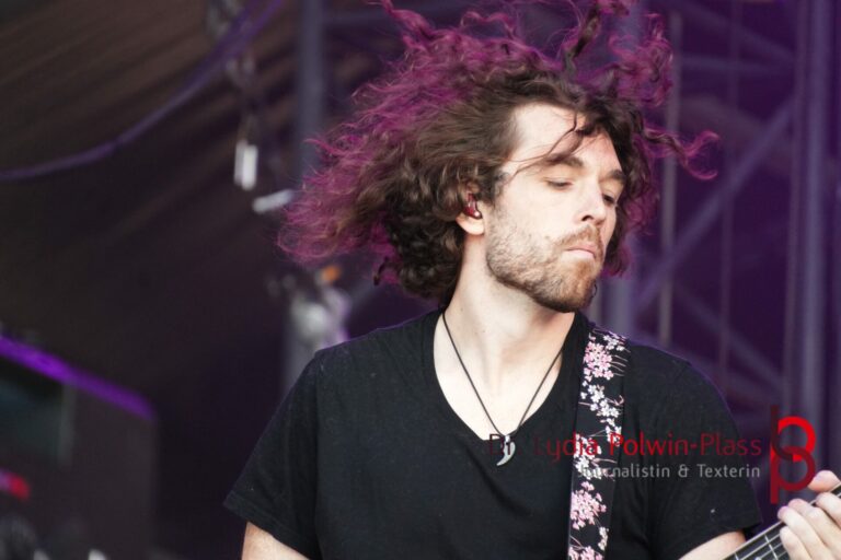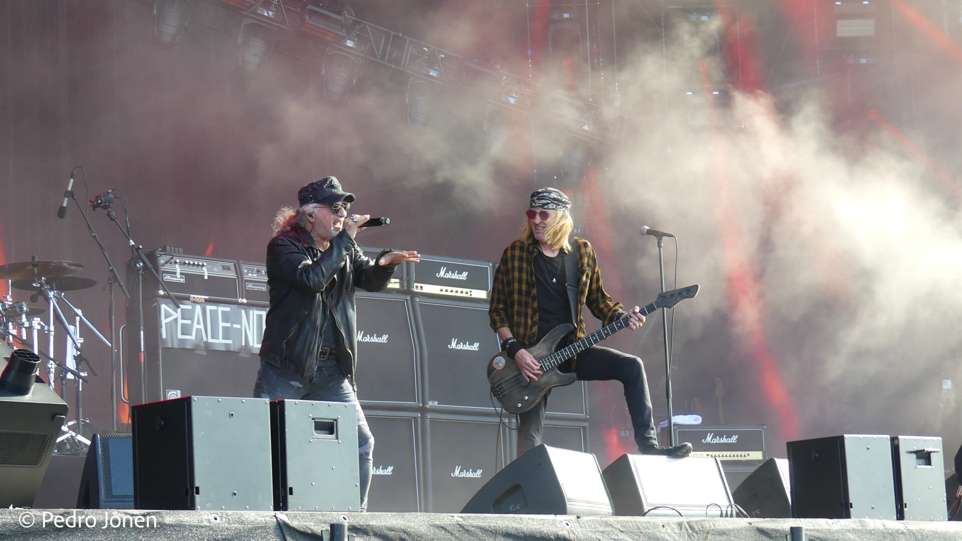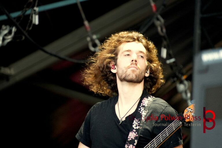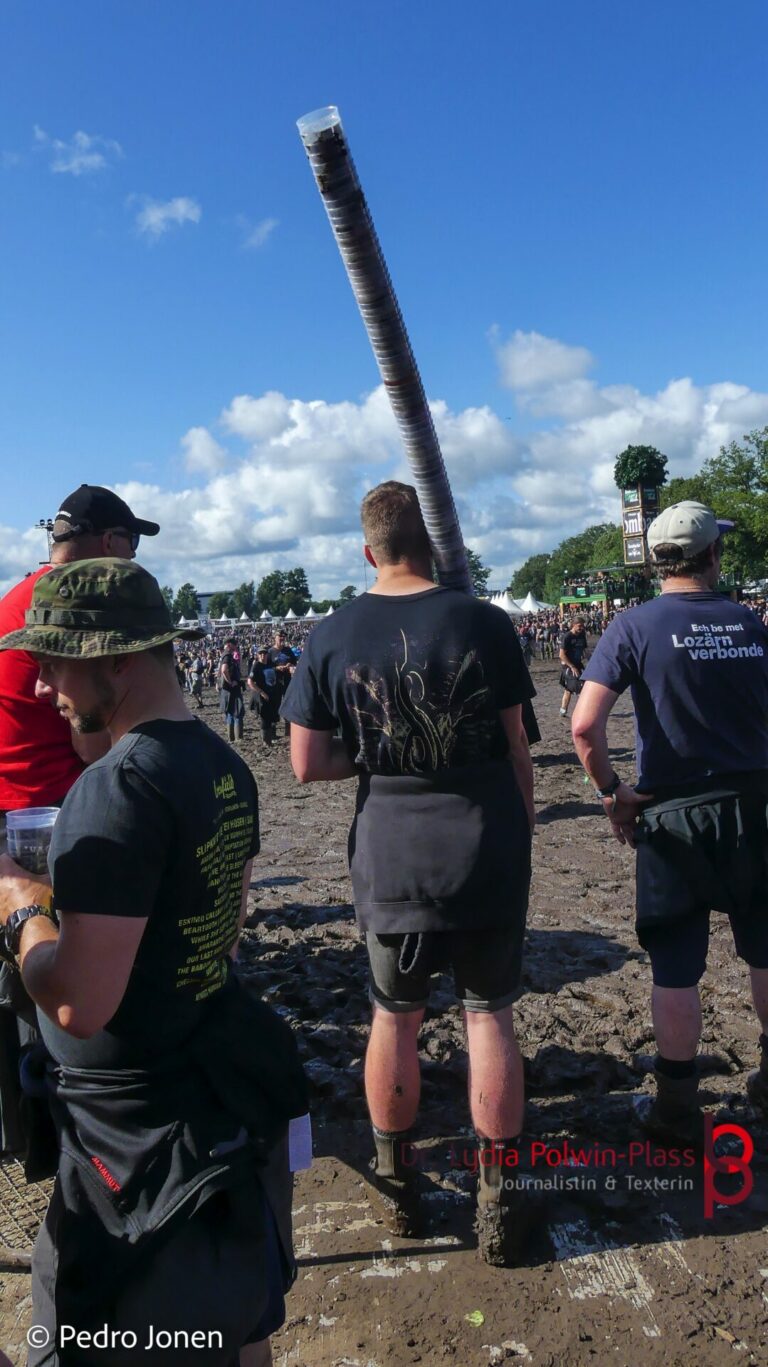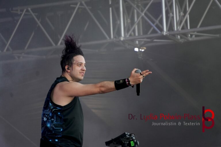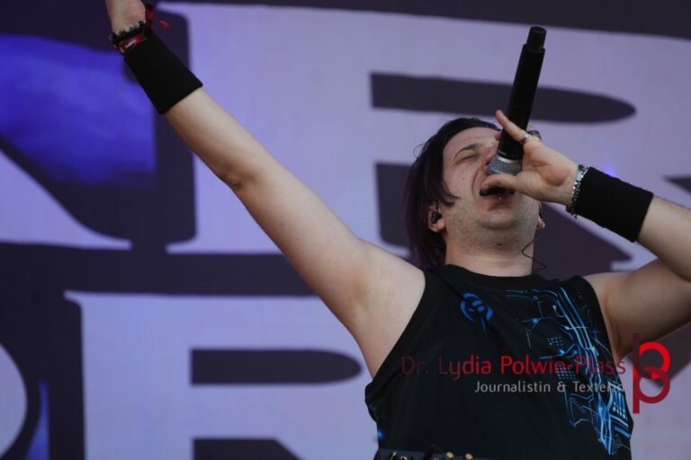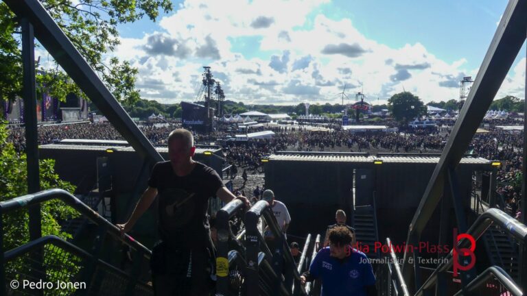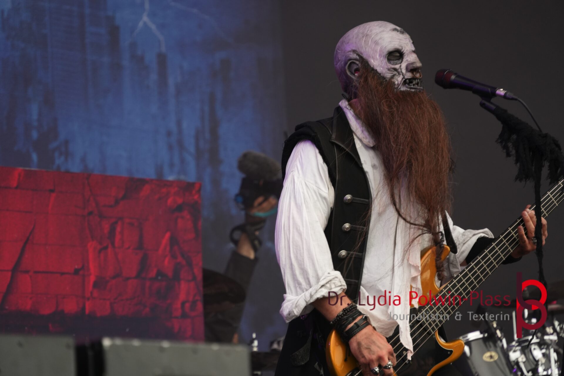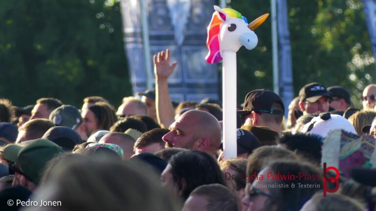 Ein bisschen Pause war nun wirklich angebracht, also setzten wir uns zwischen Harder und Louder auf eine Bank und schauten uns Bad Loverz auf Screen an. Ich sagte zu Pedro: „der Typ in den rosa 80er Jahre Klamotten mit Kreuzschnürung am Hintern sieht doch aus wie der Sänger von Saltatio Mortis. Halt, das ist ja Alea!“ Ich wusste gar nicht, dass er neben Saltatio noch eine Spaßband betreibt. Und das mit Erfolg, die lustigen Rockcovers mit Dudelsack und anderen mittelalterlichen Instrumenten in witzigen 80er Jahren Outfits gespielt, kamen unglaublich gut an.