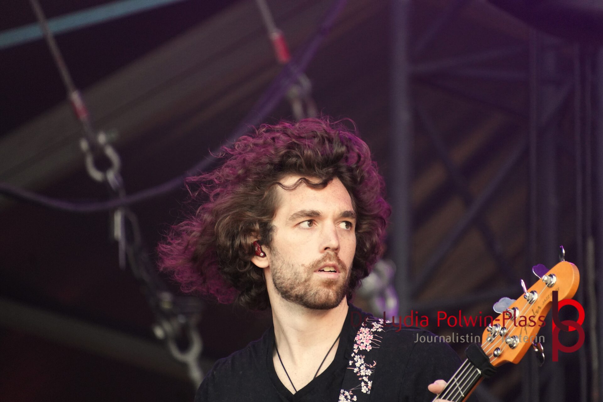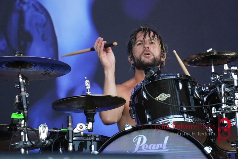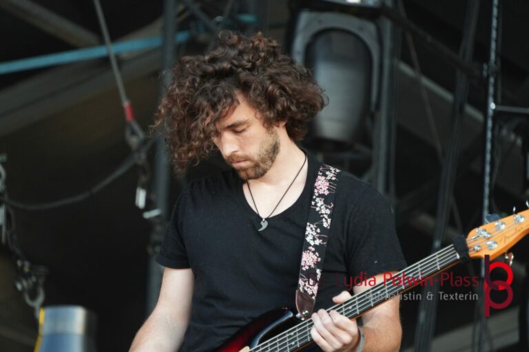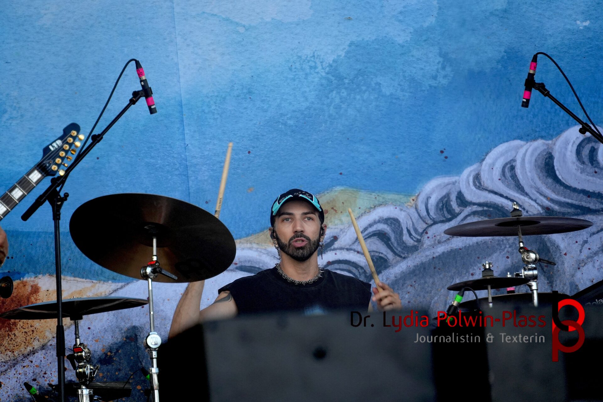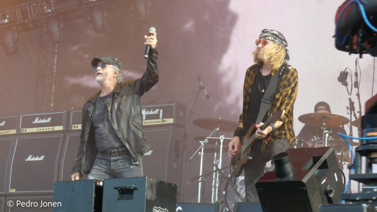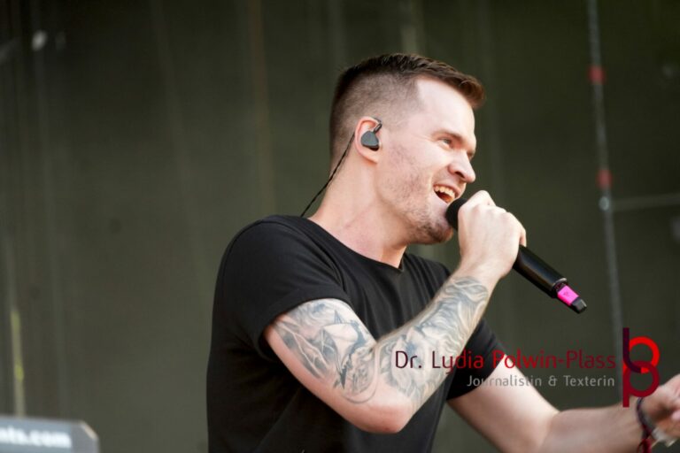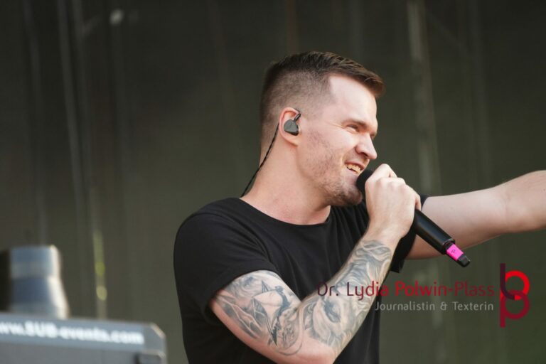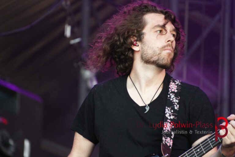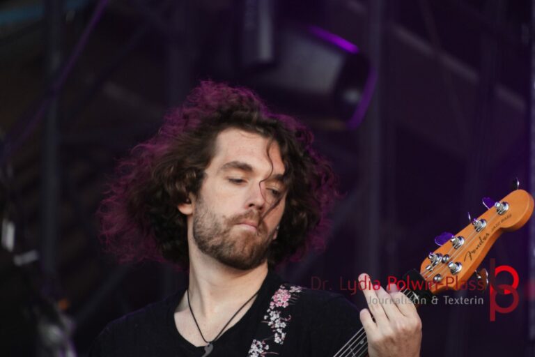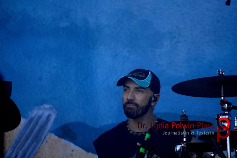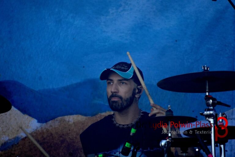 Ein bisschen Pause war nun wirklich angebracht, also setzten wir uns zwischen Harder und Louder auf eine Bank und schauten uns Bad Loverz auf Screen an. Ich sagte zu Pedro: „der Typ in den rosa 80er Jahre Klamotten mit Kreuzschnürung am Hintern sieht doch aus wie der Sänger von Saltatio Mortis. Halt, das ist ja Alea!“ Ich wusste gar nicht, dass er neben Saltatio noch eine Spaßband betreibt. Und das mit Erfolg, die lustigen Rockcovers mit Dudelsack und anderen mittelalterlichen Instrumenten in witzigen 80er Jahren Outfits gespielt, kamen unglaublich gut an.