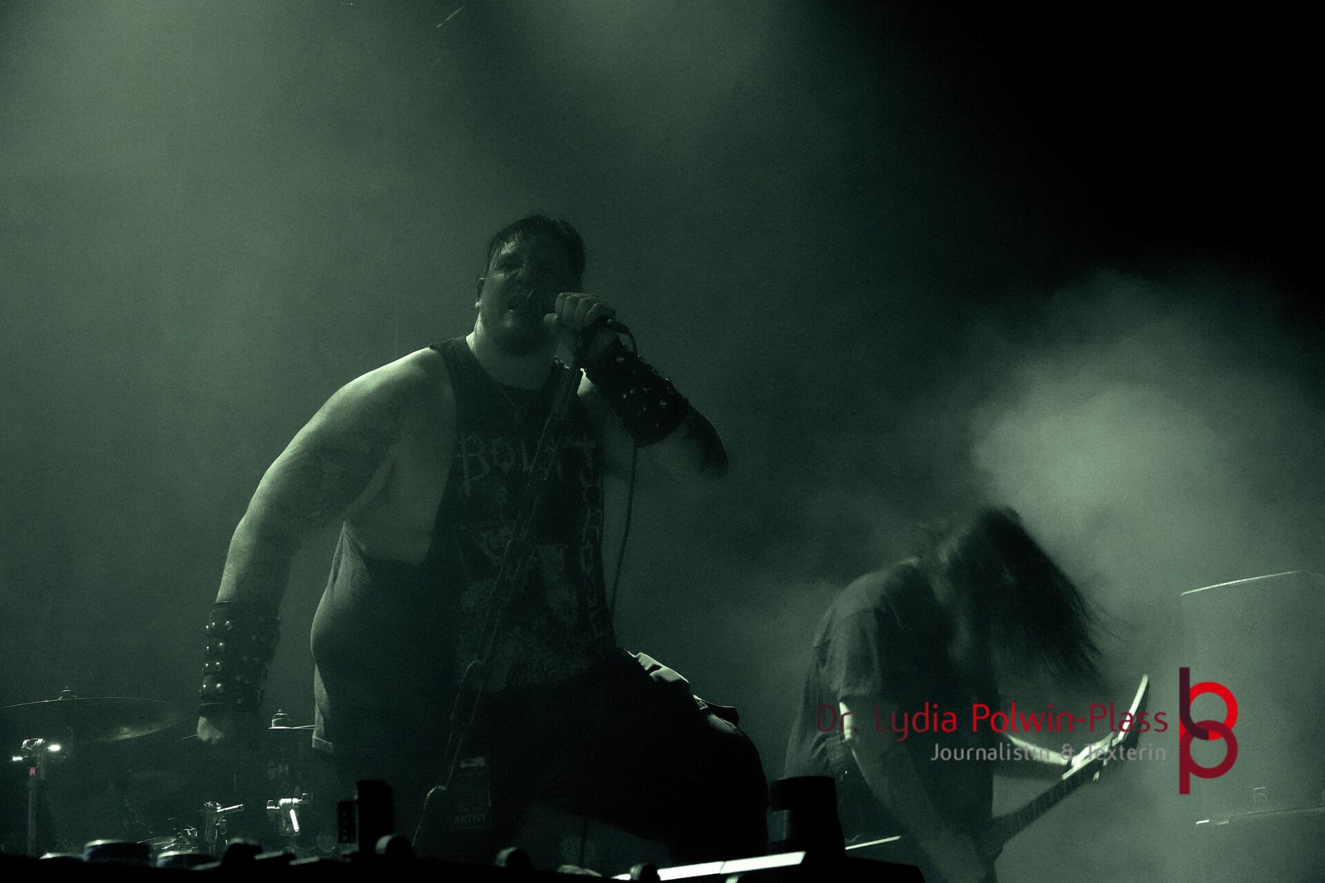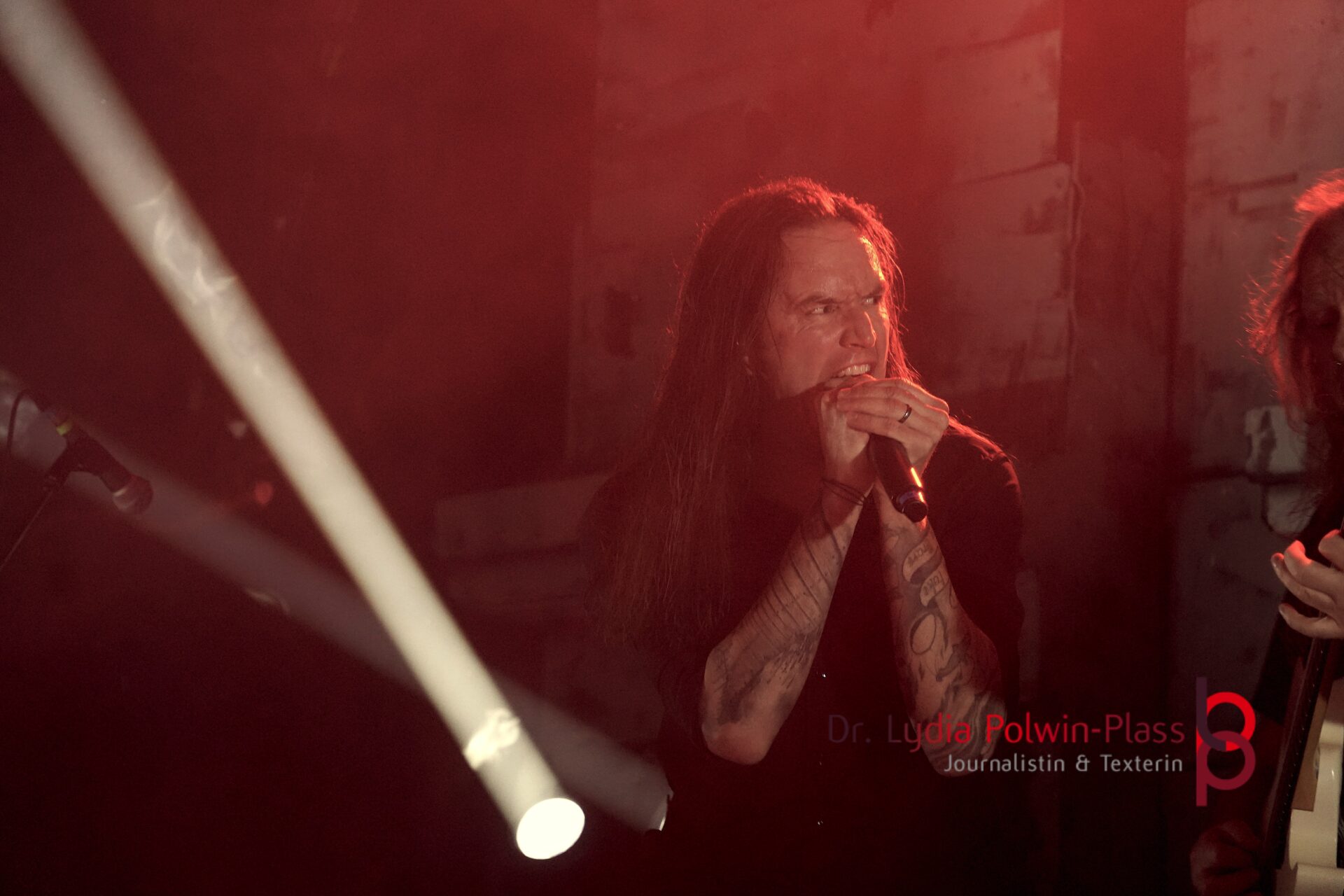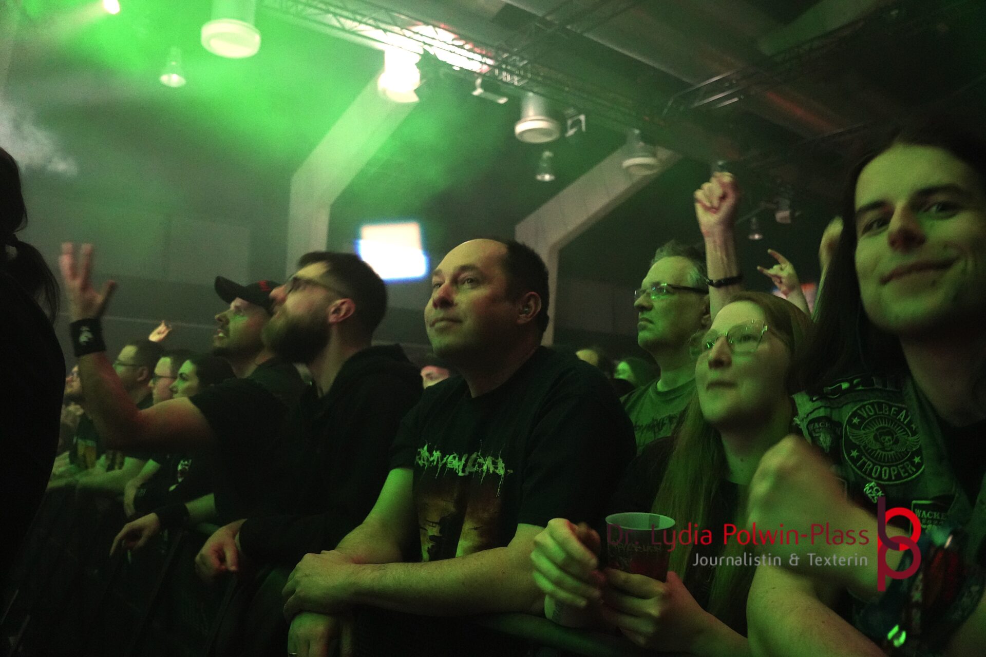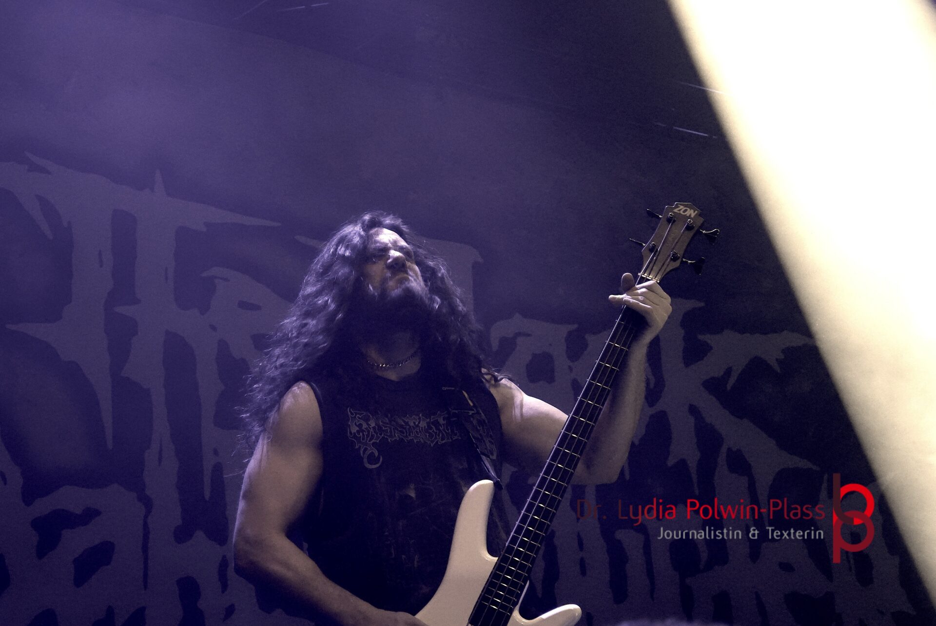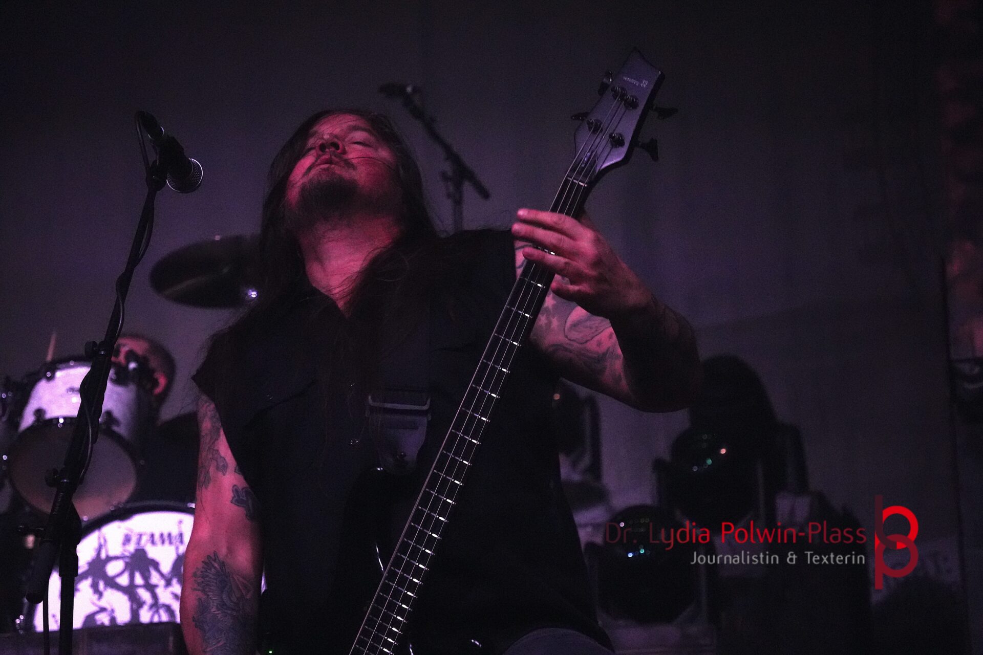 Den Auftakt machten Frozen Soul aus Texas. Die US-Band, gegründet 2018 in Fort Worth, hat sich mit ihrem kompromisslosen Old-School-Death-Metal und dem Debütalbum Crypt of Ice schnell einen Namen in der Szene erspielt. Mit schweren Riffs, tiefen Growls und eisiger Atmosphäre brachte die Band die Halle früh auf Betriebstemperatur und setzte den ersten Moshpit des Abends in Bewegung. Ich genoss jeden Ton in vollen Zügen und verausgabte mich gleich am Anfang körperlich und enegetisch. Das Licht war leider außer dunkel nur dunkel – deshalb gibt es auch nicht viele Bilder der Band.
