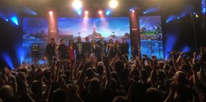 Devin Townsend’s Erscheinen vollzog sich dann inmitten einer Hawaii- Kulisse, schön gemütlich nacheinander kam die Band heraus, in der Hand einen Pina Colada. Somit war aufgezeigt, daß dies ein sehr entspannter Abend werden würde. Palmenhintergrund mit Vollmondnacht unterstützen das Motto des Abends, doch einmal für zweieinhalb Stunden das miese Leben zu vergessen und mit auf eine Reise zu kommen. Das wäre ihm ohnehin gelungen, denn Rampensau Townsend ist ein wahrer Entertainer, der ob seiner Bühnenpräsenz sofort alle Aufmerksamkeit auf sich zieht. Überhaupt reist Devin bei seiner „Empath Tour“ mit der vollen Musik an: Zehn Musiker auf der Bühne, viele davon in Doppelverwendung als Sänger. Somit unterschieden bis zu vier Gitarren, bis zu zwei Keyboarder, bis zu sieben Sänger und -Innen, samt der drei Backgroundsängerinnen, diese bunte show, vom beendeten Devin Townsend Project. Diego von Haken durfte sich umziehen und bediente mit Ananasbrille auf der Nase ein keyboard, zu seinem größten Vergnügen, wie es schien. Devin ließ es sich nicht nehmen, über die auf der Tour aufgerissenen Hämorrhoiden zu fluchen und dem folgten während der show weitere Geschichten, die hier nicht dringend besprochen werden müssen! Die Lacher waren ihm sicher!