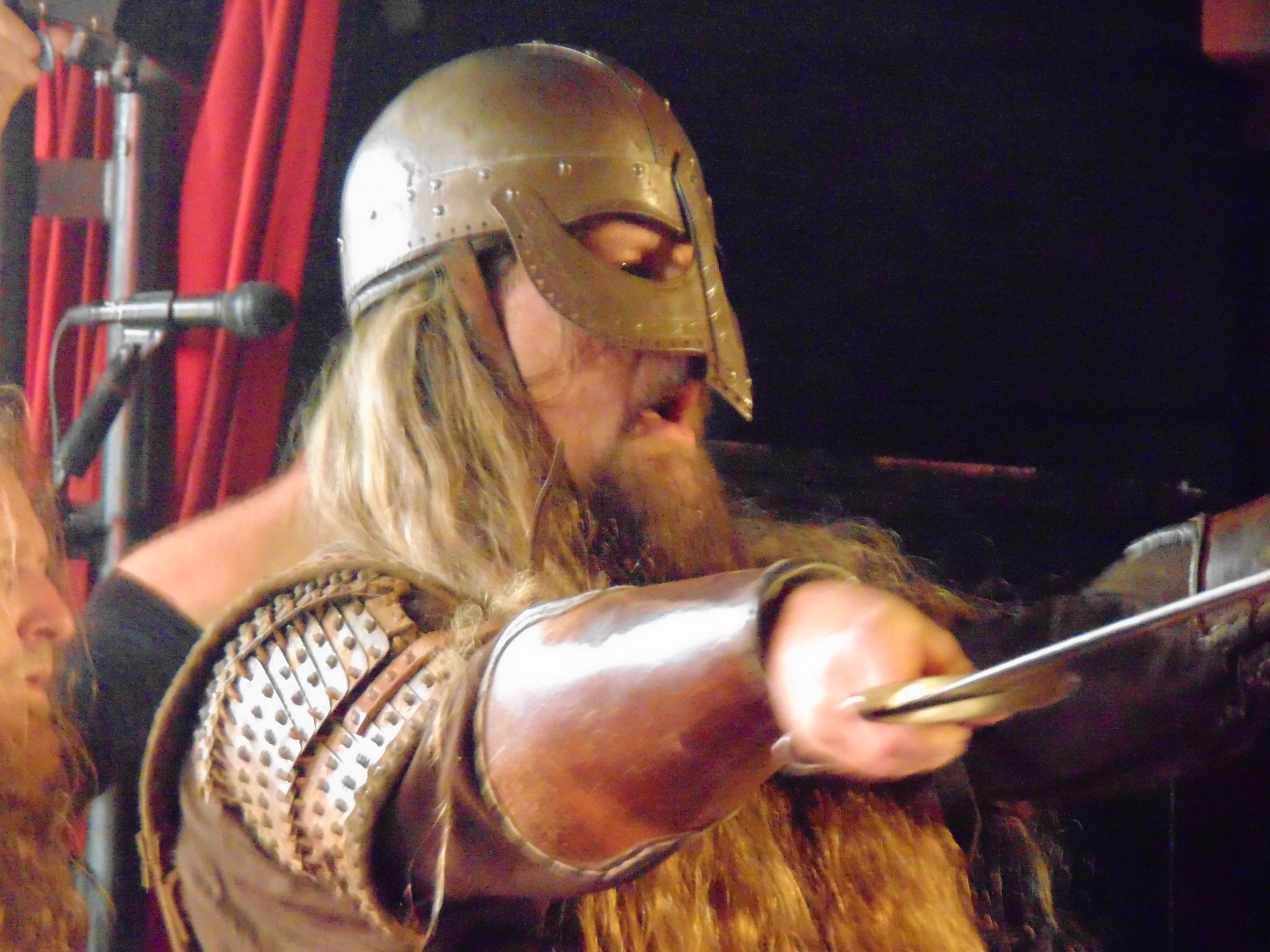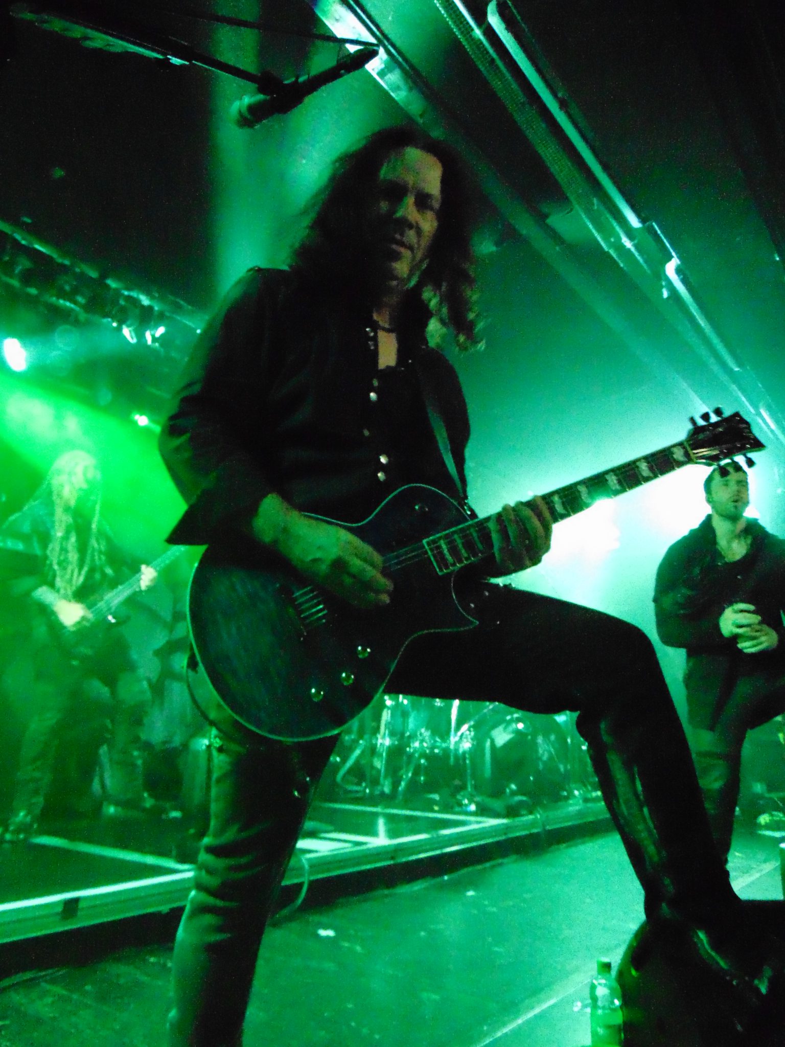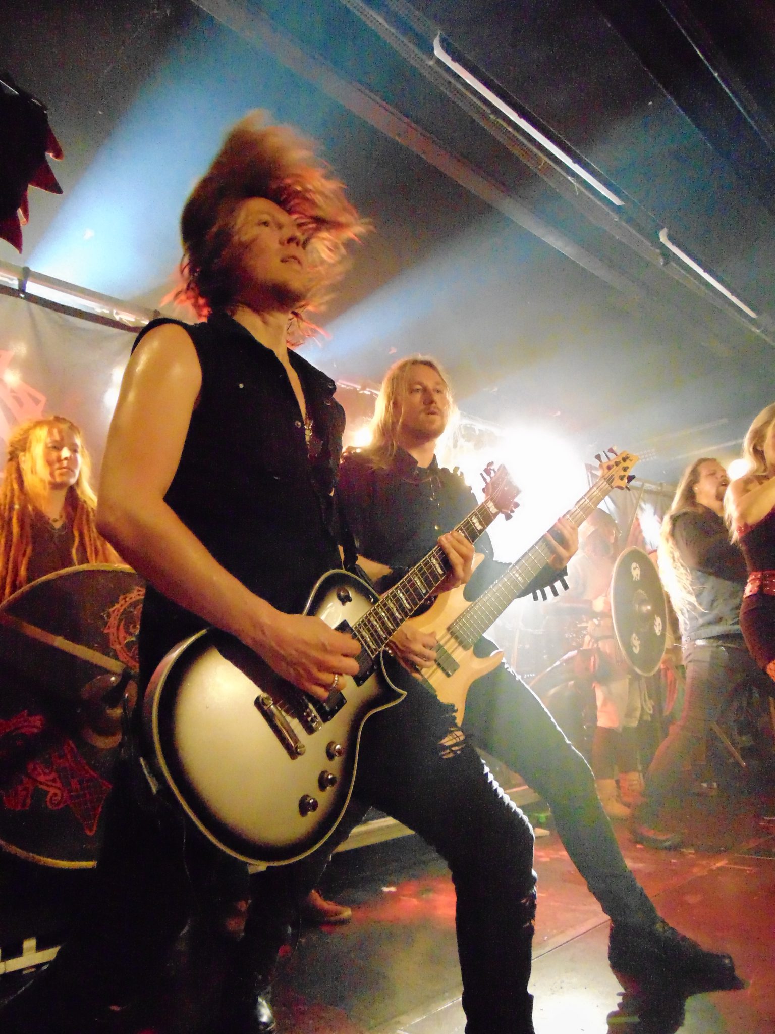 Bevor Leaves´Eyes danach im Zeichen des Drachenkopfes Gas geben konnten, marschierte zunächst eine Gruppe Wikinger samt Schwert, Schild, Rüstung und Gesichtsbemalung auf die Bühne. Das sollte natürlich kein Überfall sein, sondern das aktuelle Album „Sign Of The Dragonhead“ visuell unterstützen. Die Wikingertruppe kehrte später für zwei weitere Songs zurück. Dabei hatten Leaves´ Eyes an diesem Abend sicherlich keine Unterstützung nötig. Die aufgewärmte Fanschar ließ sich augenblicklich vom Symphonic Metal der Marke Leaves´ Eyes mitreißen und gab ihrerseits Vollgas. Es wurde munter gebangt, gehüpft, gegrölt und pausenlos wellenartig die Pommesgabel gen Himmel gestreckt. Zudem hatte die Band sichtlich Spaß. Sänger Alexander Krull hatte leichtes Spiel und stachelte das Publikum zudem mit seinen Ansagen weiter an. Daneben glänzte nicht nur Sängerin Elina Siirala, sondern die ganze Band. So wurden die Hits und neue Songs frenetisch gefeiert. Zum krönenden Abschluss „Blazing Waters“ gab Sänger Alexander selber in Wikinger-Montur noch einmal alles und auf der nun – dank der Anwesenheit der Wikinger-Truppe – vollbesetzten Bühne ging es mächtig ab. Leaves´ Eyes haben stimmungsmäßig mächtig abgeräumt und dem folgenden Headliner eine glückliche Meute überlassen.