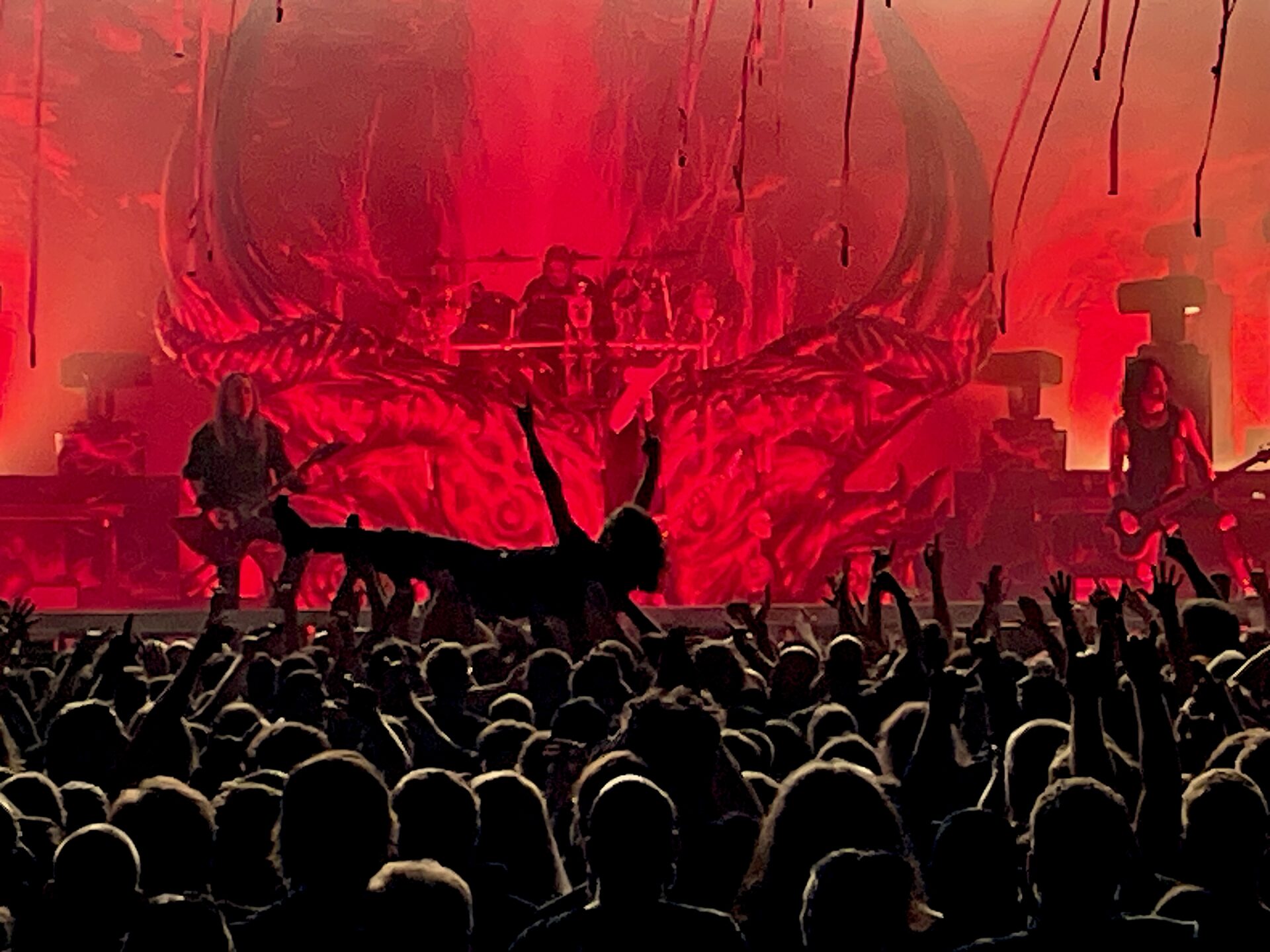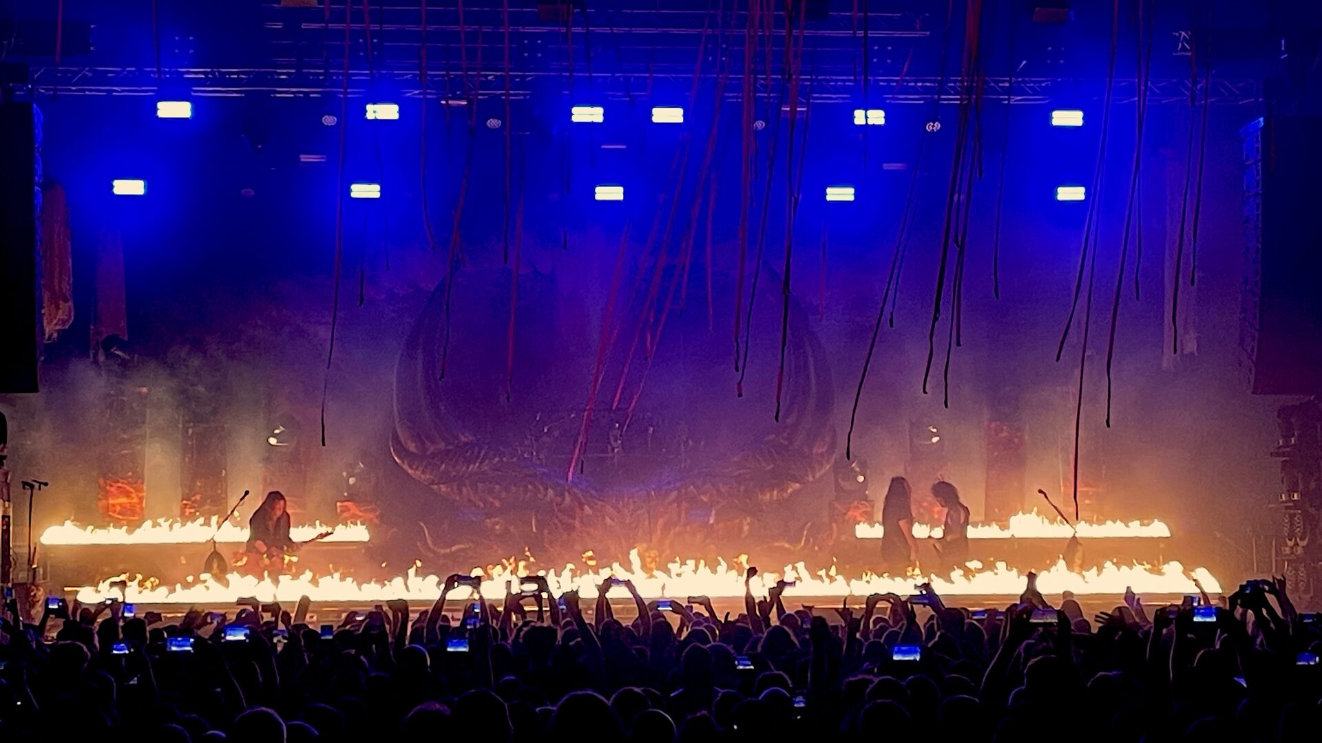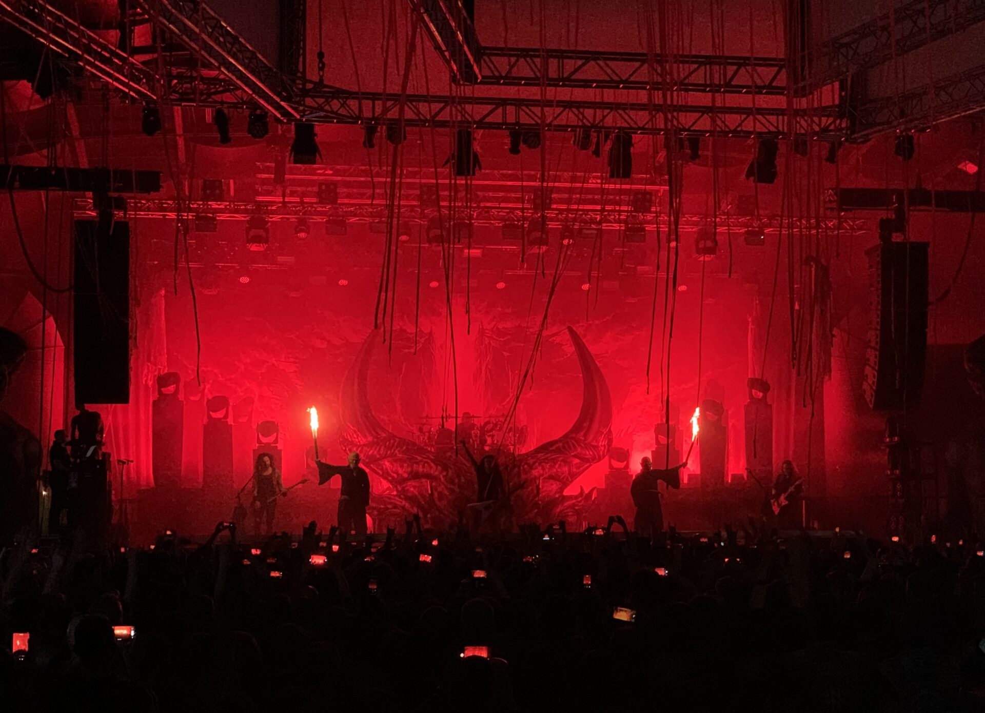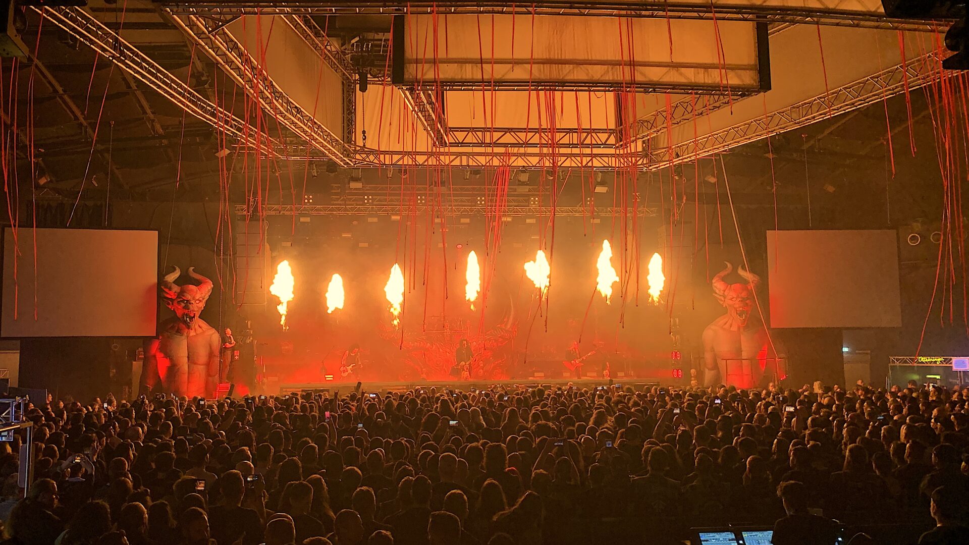 Als schließlich Kreator die cool dekorierte Bühne übernahmen, war die Halle bereits am Kochen. Frontmann Mille Petrozza präsentierte sich in Bestform und führte die Band mit ungebrochener Leidenschaft durch ein Set aus neuen Songs vom aktuellen Album Krushers Of The World und zahlreichen Klassikern.