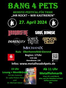 Unter dem Motto BLACK AS NIGHT – FOR PETS WE FIGHT findet am 27.4. in Oberhonnefeld – Gierend das gemeinnützige Metalfestival BANG4PETS statt. Im Rahmen der Veranstaltung gibt es um 15h auch eine Autoren-LESUNG zum Buch „WACKEN – das perfekte Paralleluniversum: Was die Gesellschaft von Metalheads lernen kann“ mit anschließendem Meet & Greet und Signiersession.