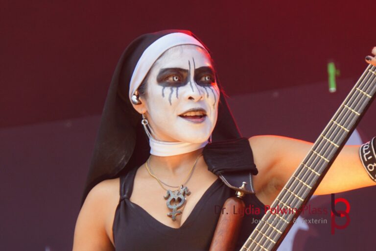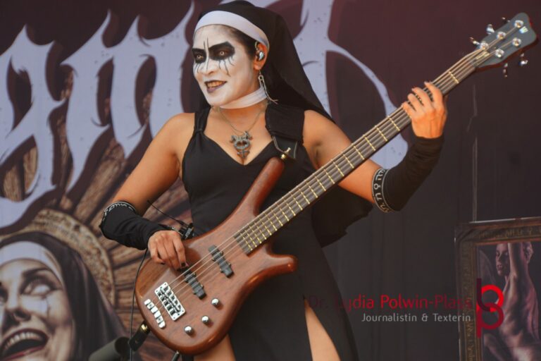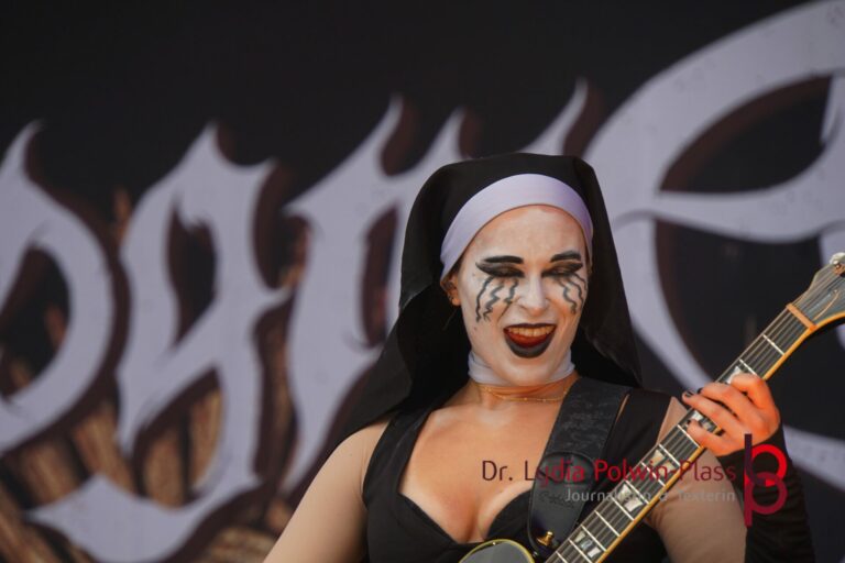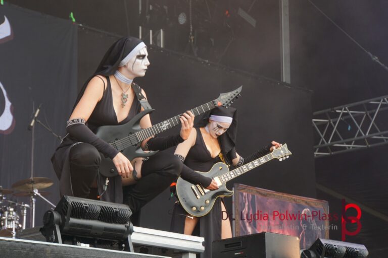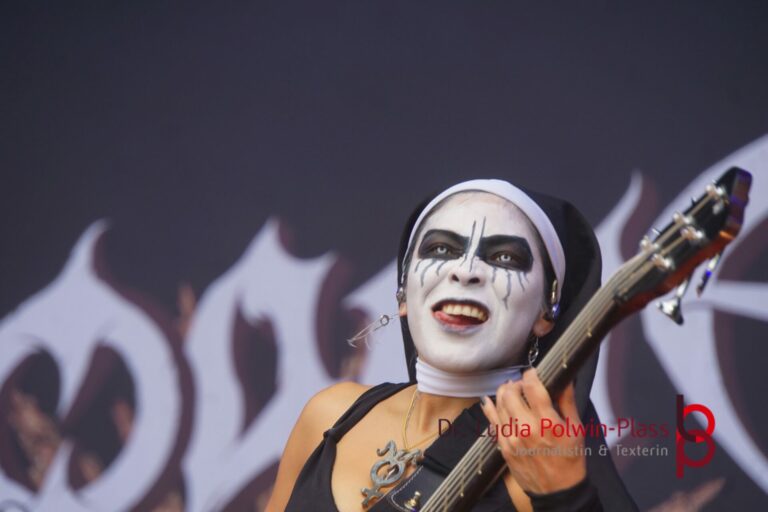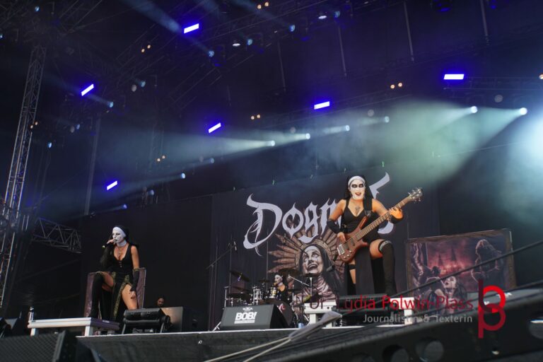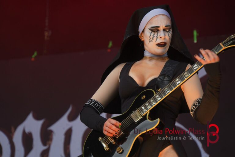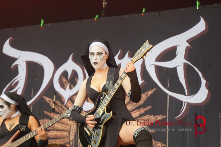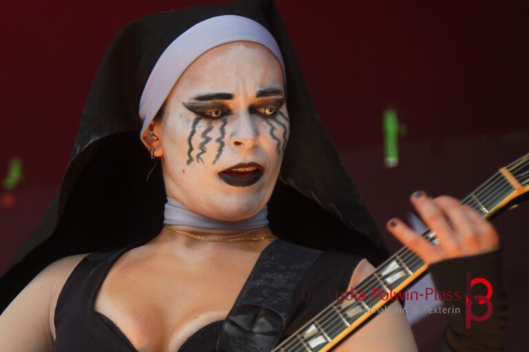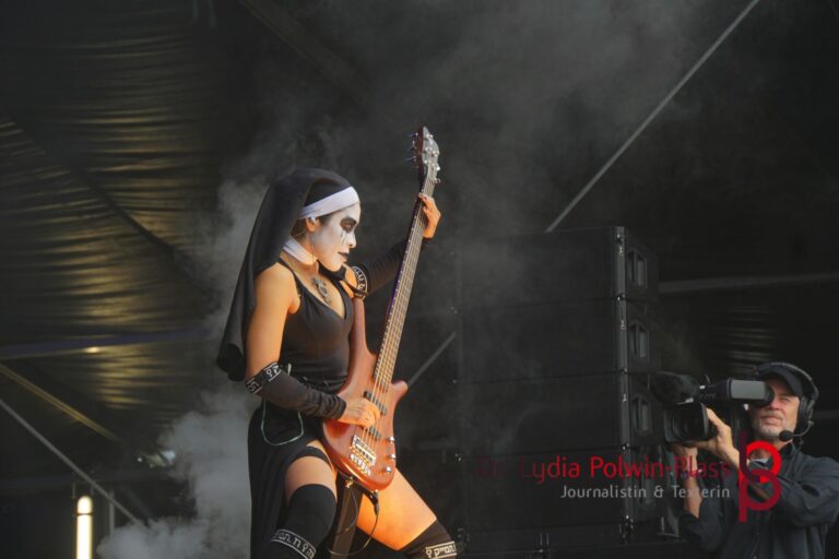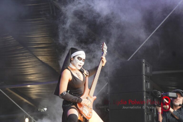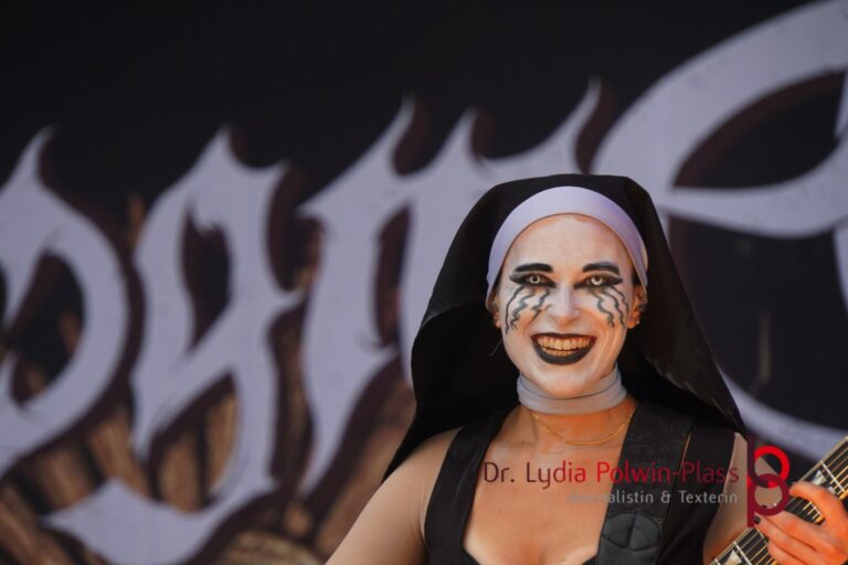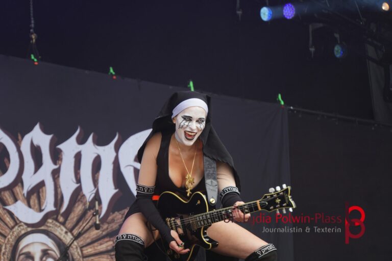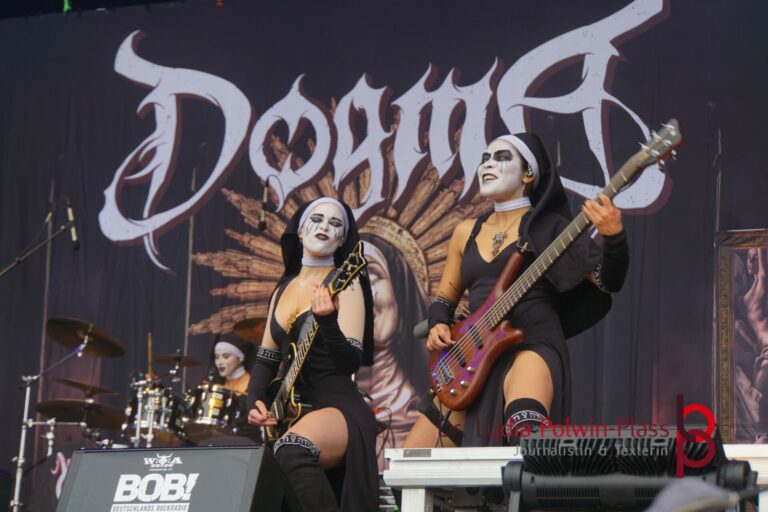 Ich hatte mir in den Kopf gesetzt, meinen heutigen Kulturgenuss mit der all-female Band Dogma zu beginnen. Die lasziven „Nonnen“ lieferten schon zu früher Uhrzeit ordentlich ab und boten gleichzeitig eine ziemlich coole Show. Da es wieder stark regnete, hatte ich beschlossen die alte Kamera zu verwenden und die neue im Auto zu lassen. Leider streikten, wahrscheinlich durch die Feuchtigkeit, schon gleich nach DOGMA alle vollen Akus. Also musst ich mich durch den Schlamm zum Shuttlebus kämpfen, um doch die neue Kamera zu holen.