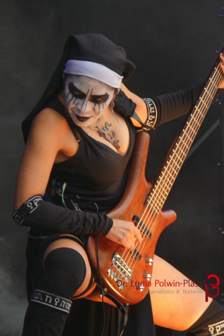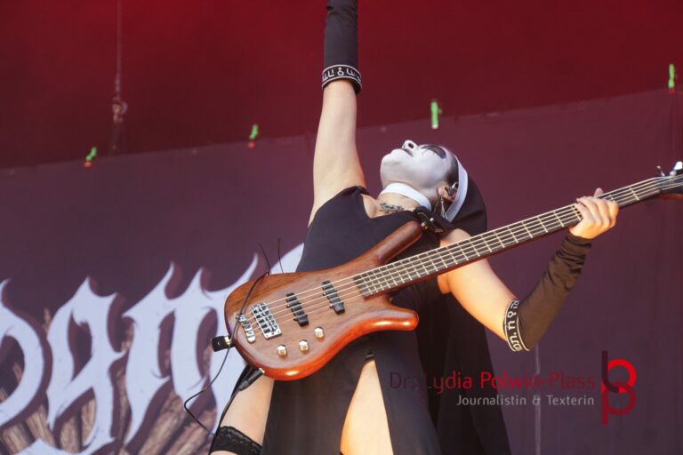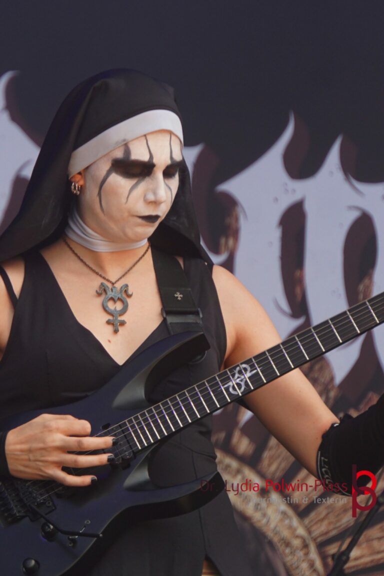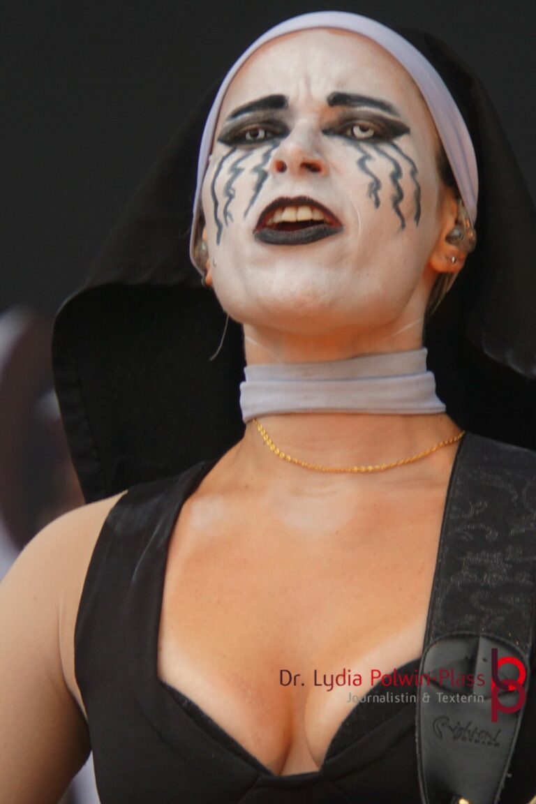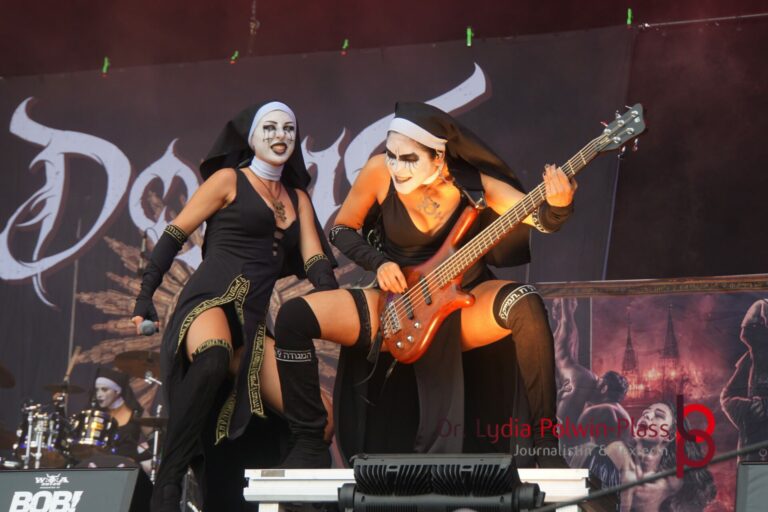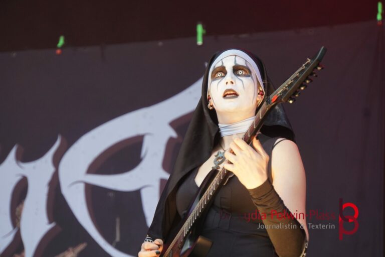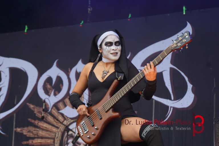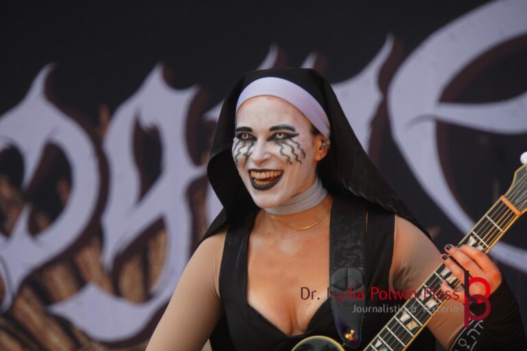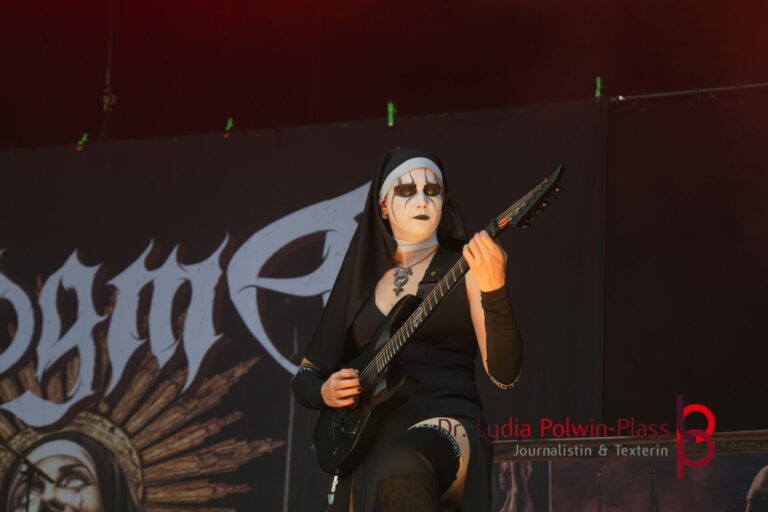 Ich hatte mir in den Kopf gesetzt, meinen heutigen Kulturgenuss mit der all-female Band Dogma zu beginnen. Die lasziven „Nonnen“ lieferten schon zu früher Uhrzeit ordentlich ab und boten gleichzeitig eine ziemlich coole Show. Da es wieder stark regnete, hatte ich beschlossen die alte Kamera zu verwenden und die neue im Auto zu lassen. Leider streikten, wahrscheinlich durch die Feuchtigkeit, schon gleich nach DOGMA alle vollen Akus. Also musst ich mich durch den Schlamm zum Shuttlebus kämpfen, um doch die neue Kamera zu holen.