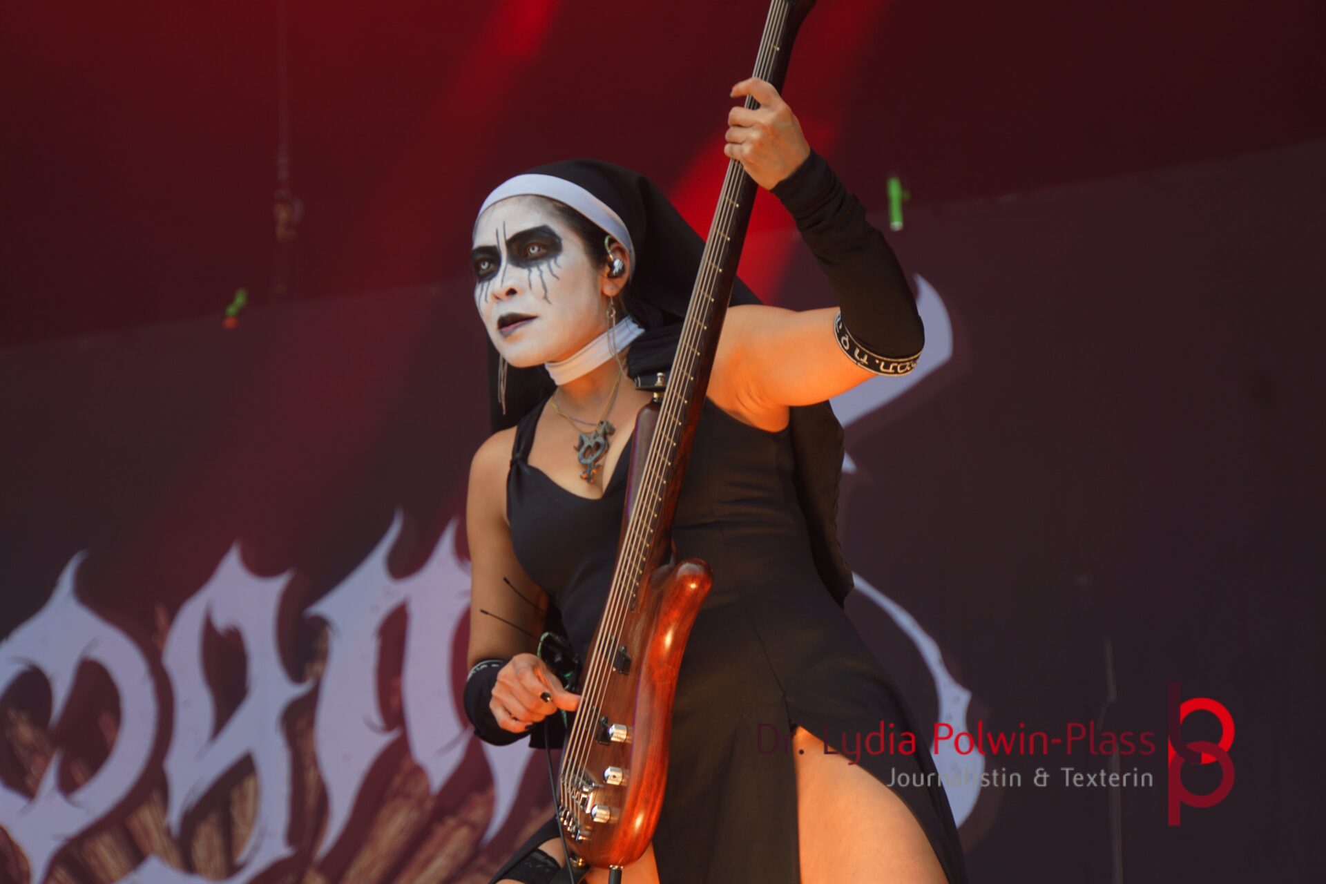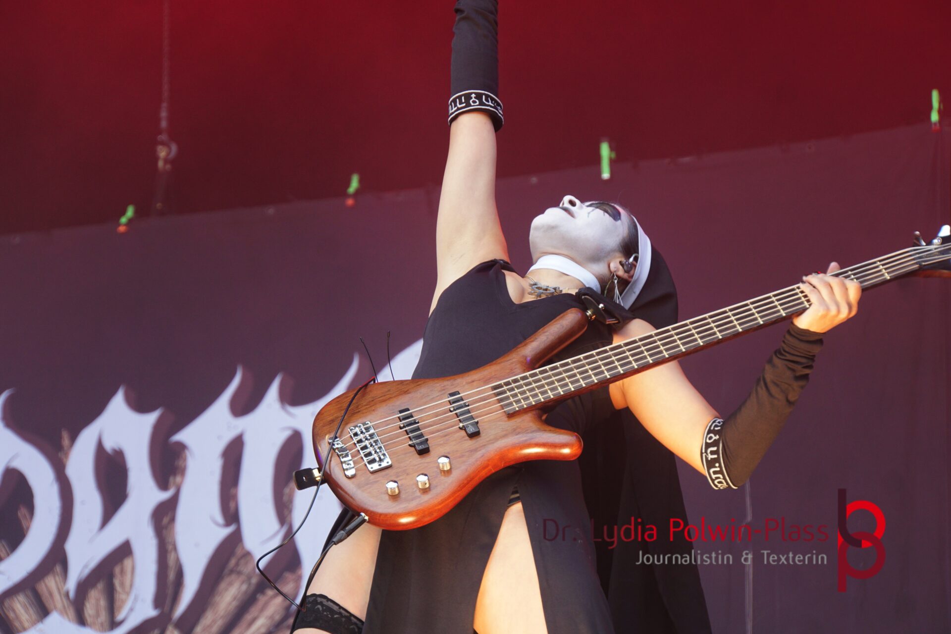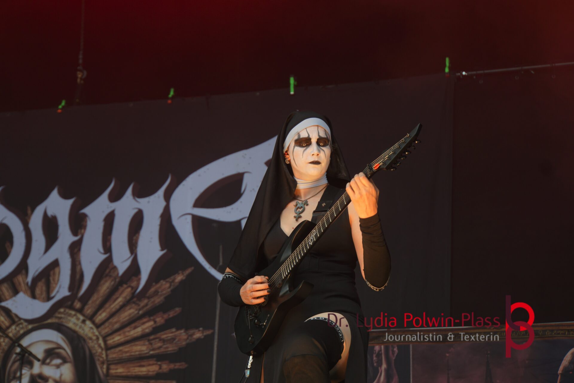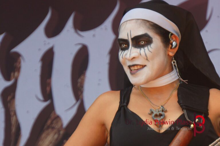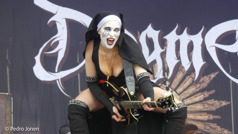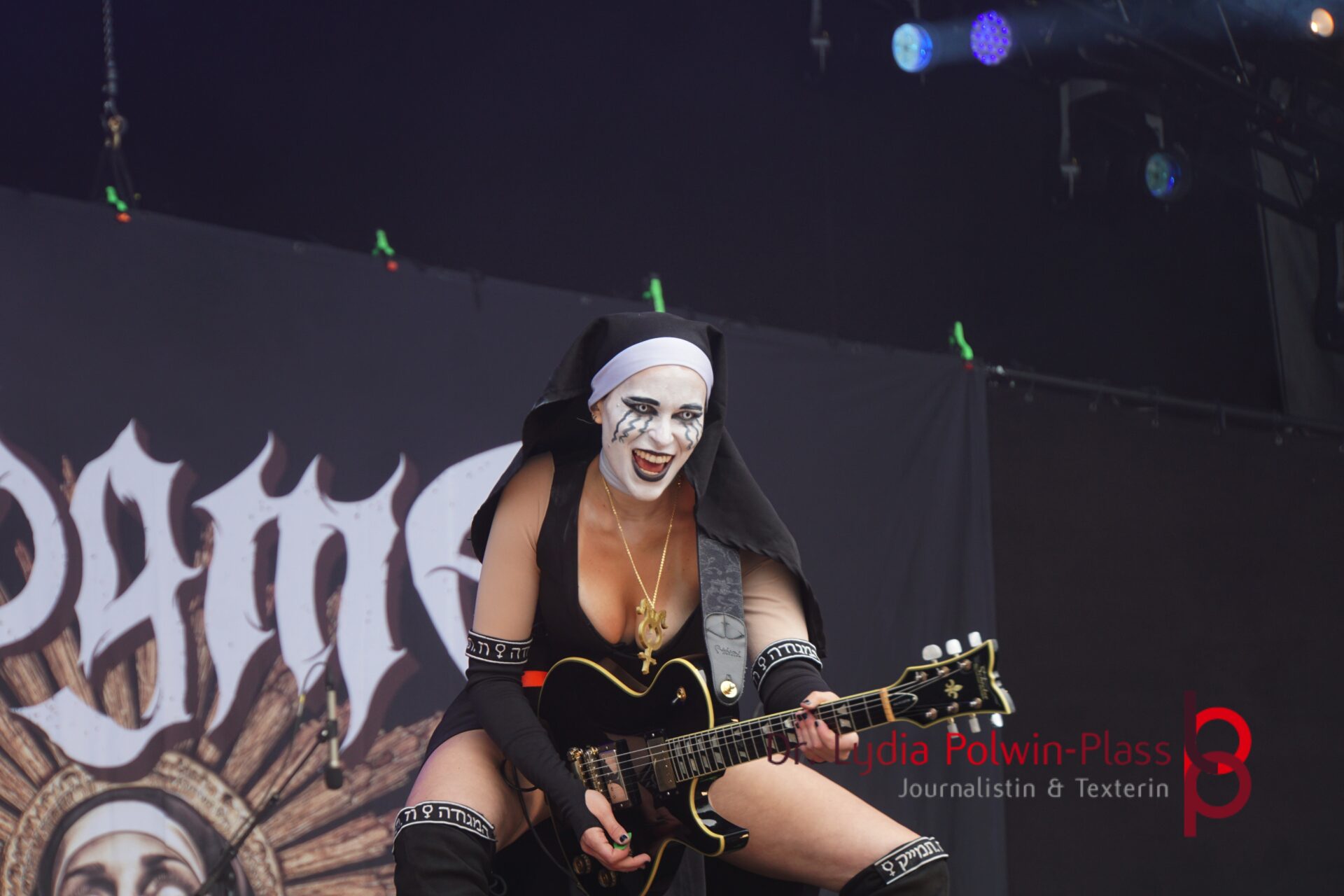 Ich hatte mir in den Kopf gesetzt, meinen heutigen Kulturgenuss mit der all-female Band Dogma zu beginnen. Die lasziven „Nonnen“ lieferten schon zu früher Uhrzeit ordentlich ab und boten gleichzeitig eine ziemlich coole Show. Da es wieder stark regnete, hatte ich beschlossen die alte Kamera zu verwenden und die neue im Auto zu lassen. Leider streikten, wahrscheinlich durch die Feuchtigkeit, schon gleich nach DOGMA alle vollen Akus. Also musst ich mich durch den Schlamm zum Shuttlebus kämpfen, um doch die neue Kamera zu holen.