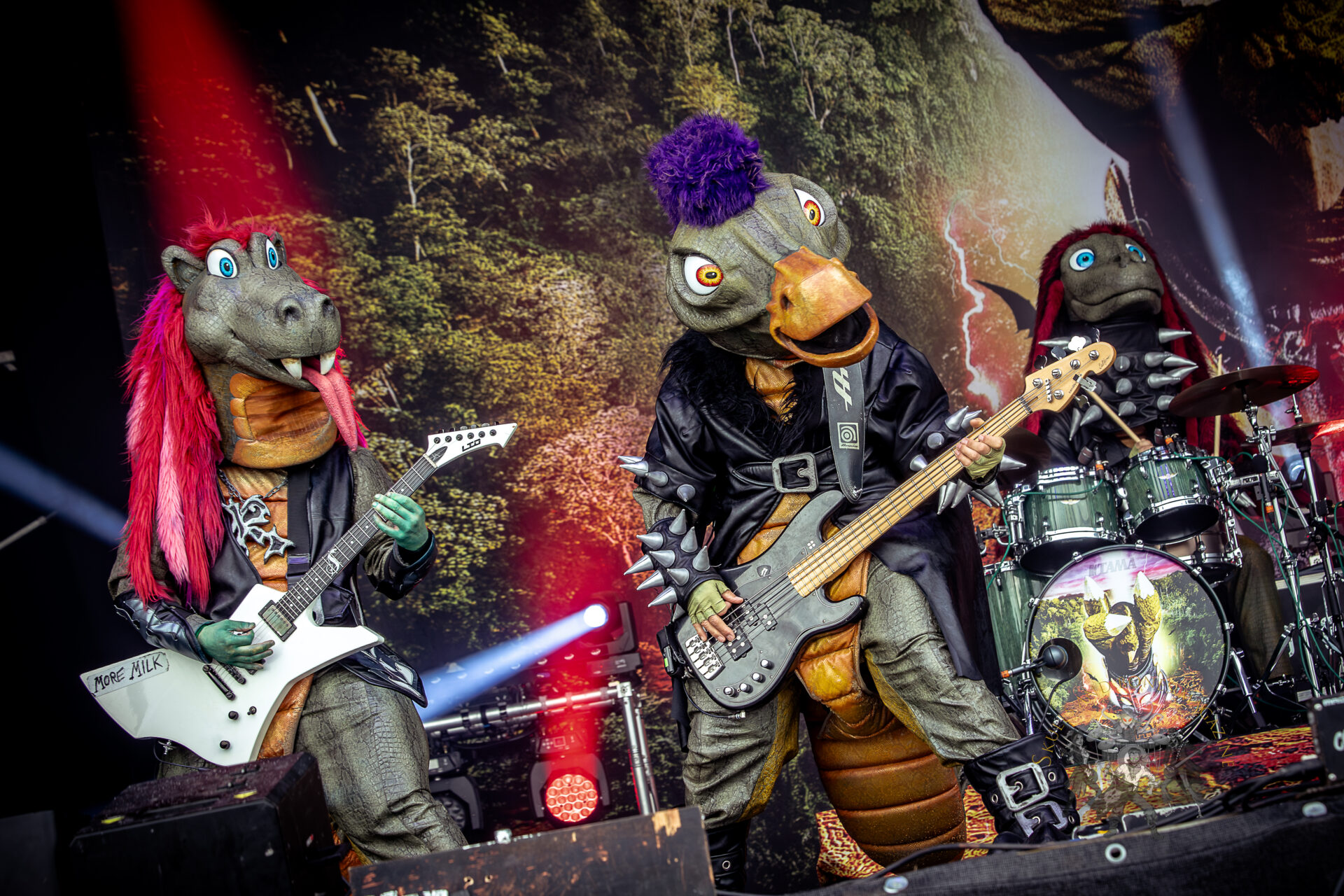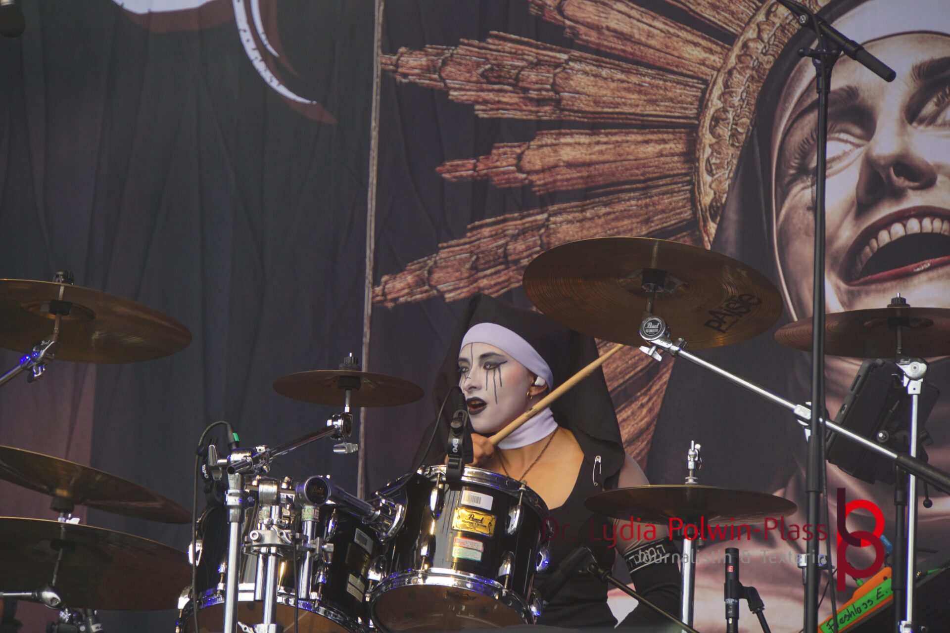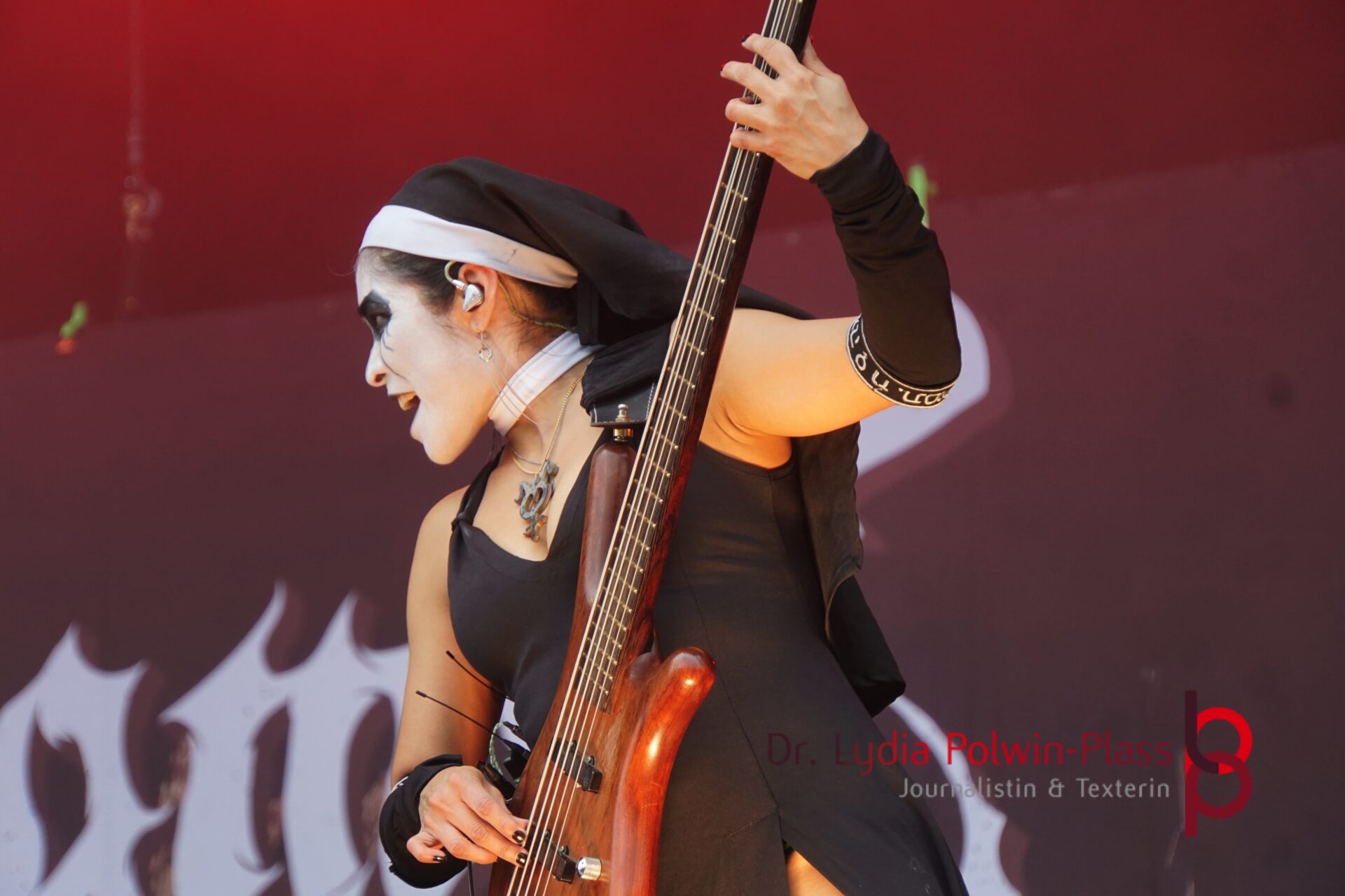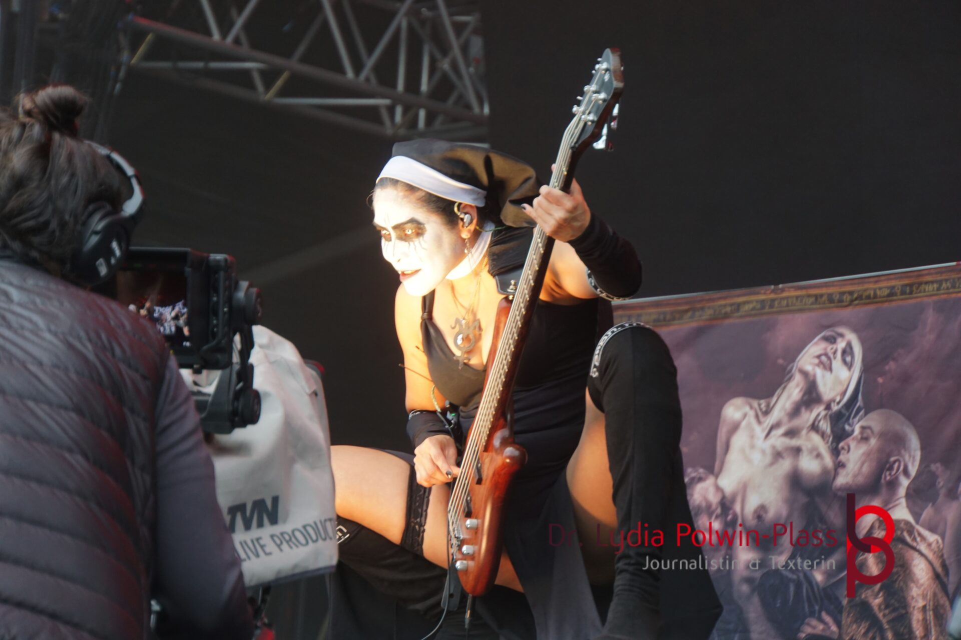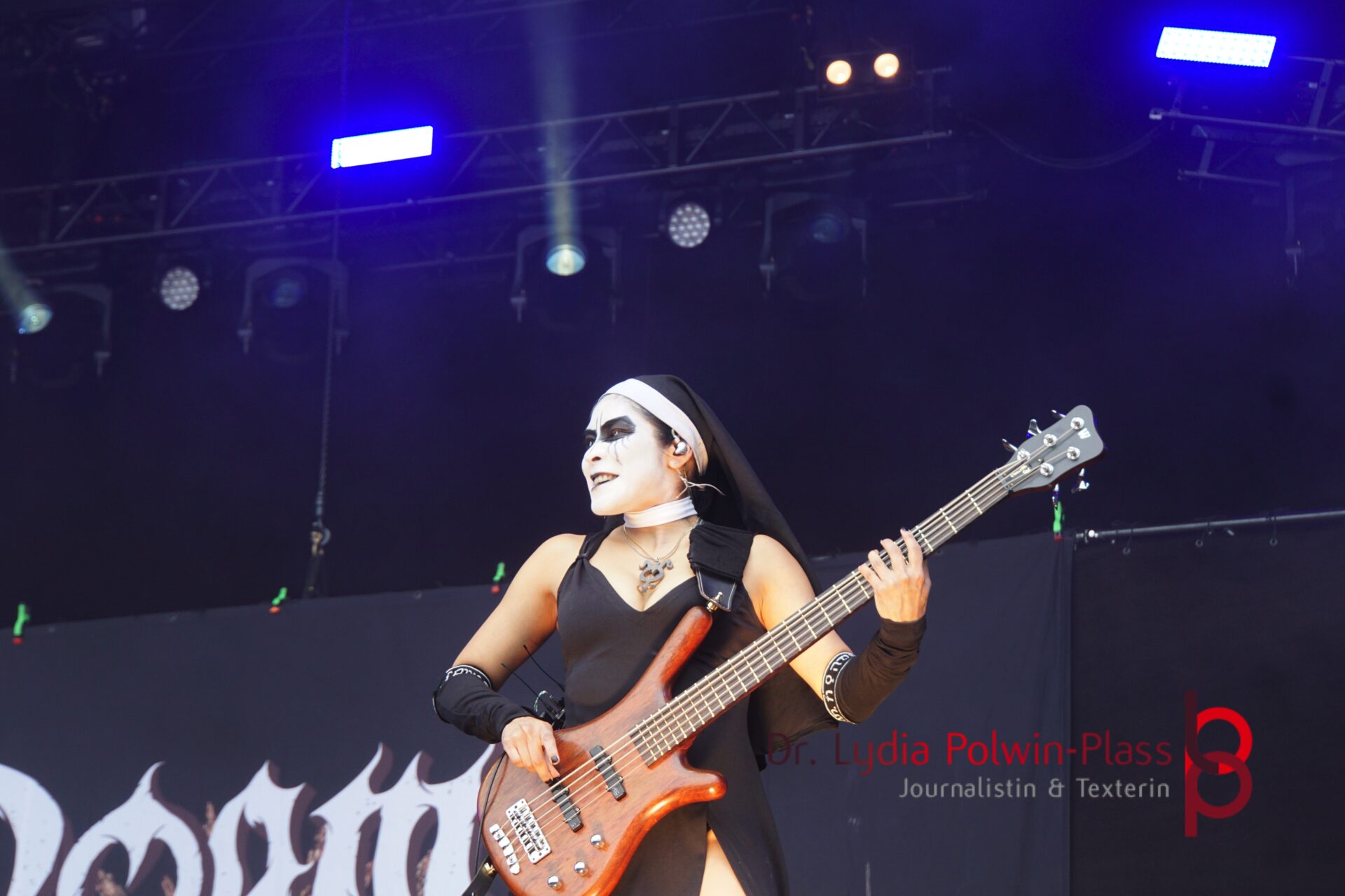 Ich hatte mir in den Kopf gesetzt, meinen heutigen Kulturgenuss mit der all-female Band Dogma zu beginnen. Die lasziven „Nonnen“ lieferten schon zu früher Uhrzeit ordentlich ab und boten gleichzeitig eine ziemlich coole Show. Da es wieder stark regnete, hatte ich beschlossen die alte Kamera zu verwenden und die neue im Auto zu lassen. Leider streikten, wahrscheinlich durch die Feuchtigkeit, schon gleich nach DOGMA alle vollen Akus. Also musst ich mich durch den Schlamm zum Shuttlebus kämpfen, um doch die neue Kamera zu holen.
